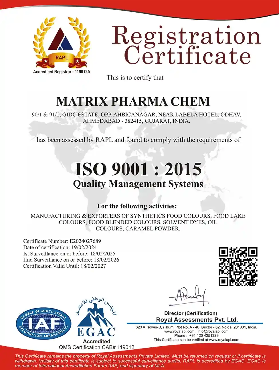 Incepted in 1988, we MATRIX PHARMA CHEM are leading Manufacturer, Exporter and Supplier of highly effective range of Synthetic Food Colours, Lake Colours, Blended Food Colours, Cosmetic Colours (Oil Soluble & Water soluble Base), Natural Caramel Powder, Solvent Dyes, Pigments Colours, Acid Dyes, Leather Dyes, Basic Dyes and Oil Dyes. Situated at Ahmedabad (Gujarat, India),